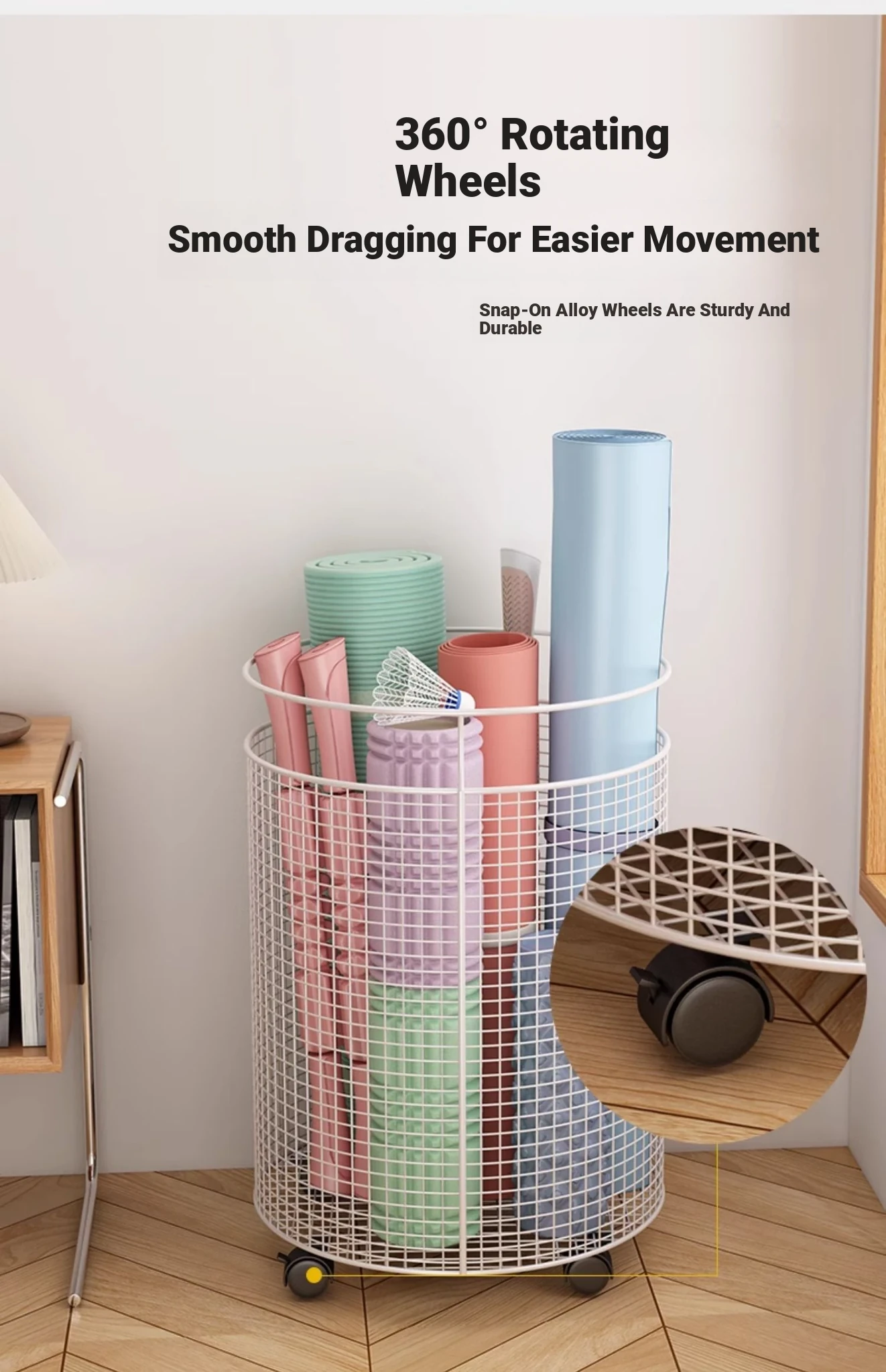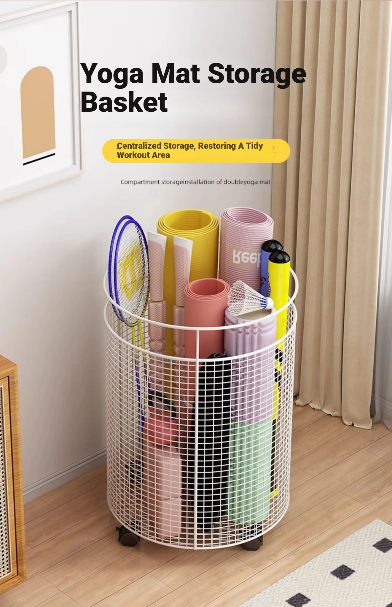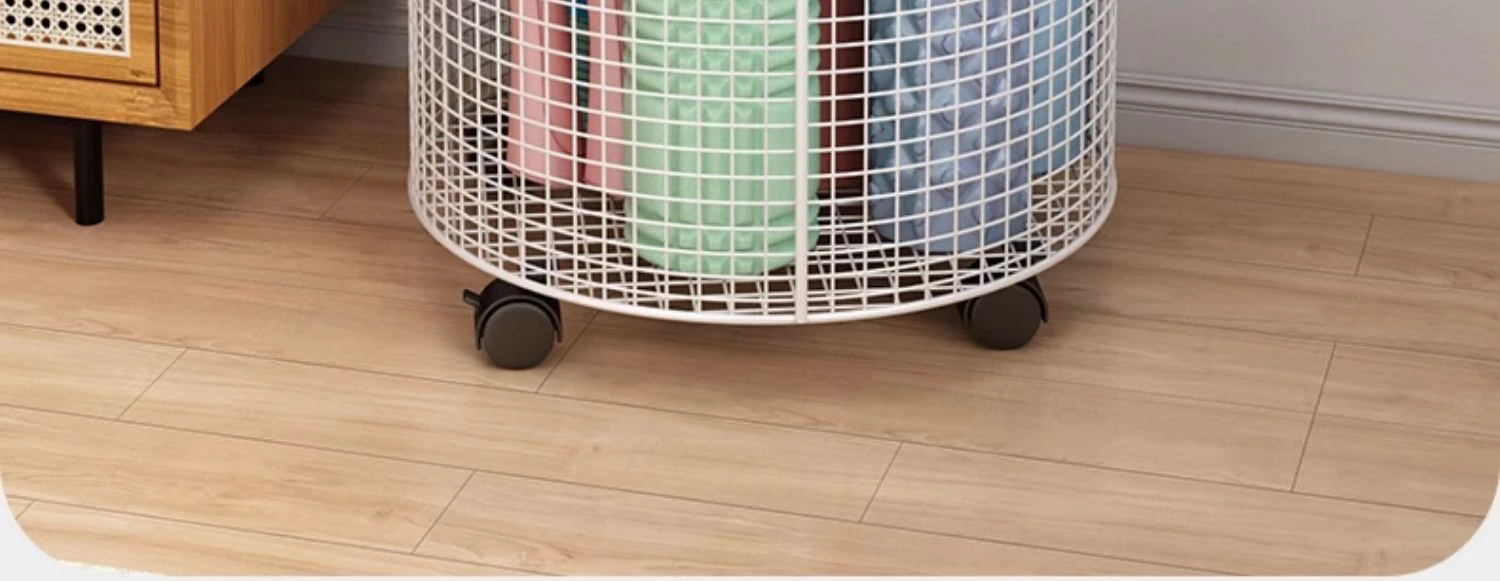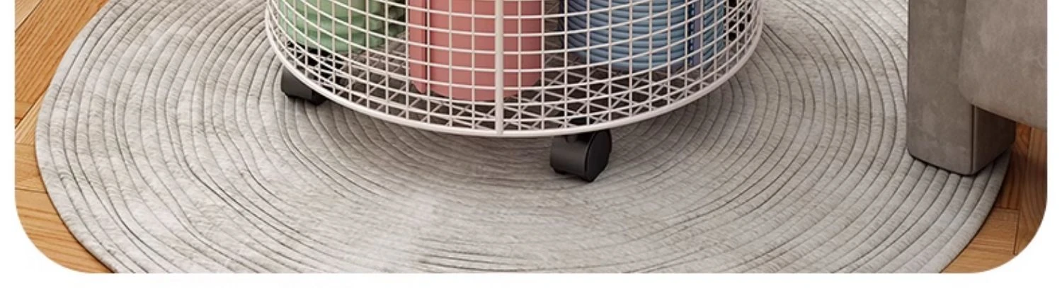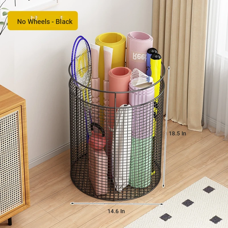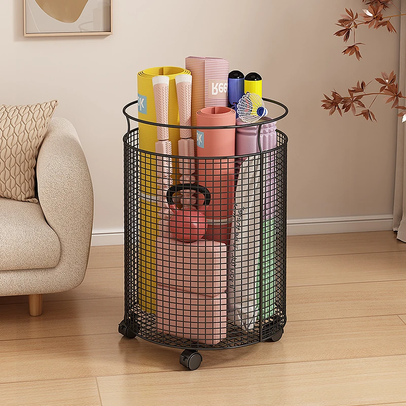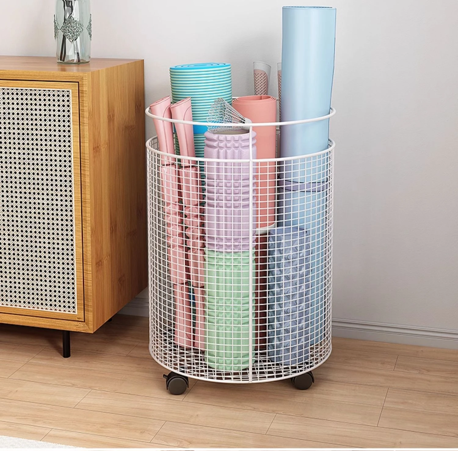 Yoga Mat Storage Rack with Wheels - Multi-functional Floor Organizer for Fitness Equipment, Foam Rollers, and Dumbbells - Stylish Round Storage Bin for Your Home Gym