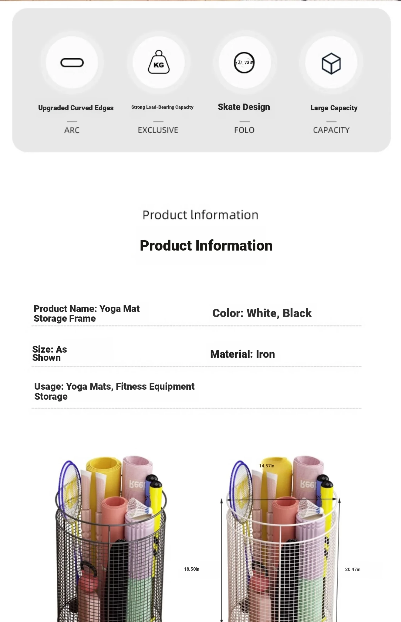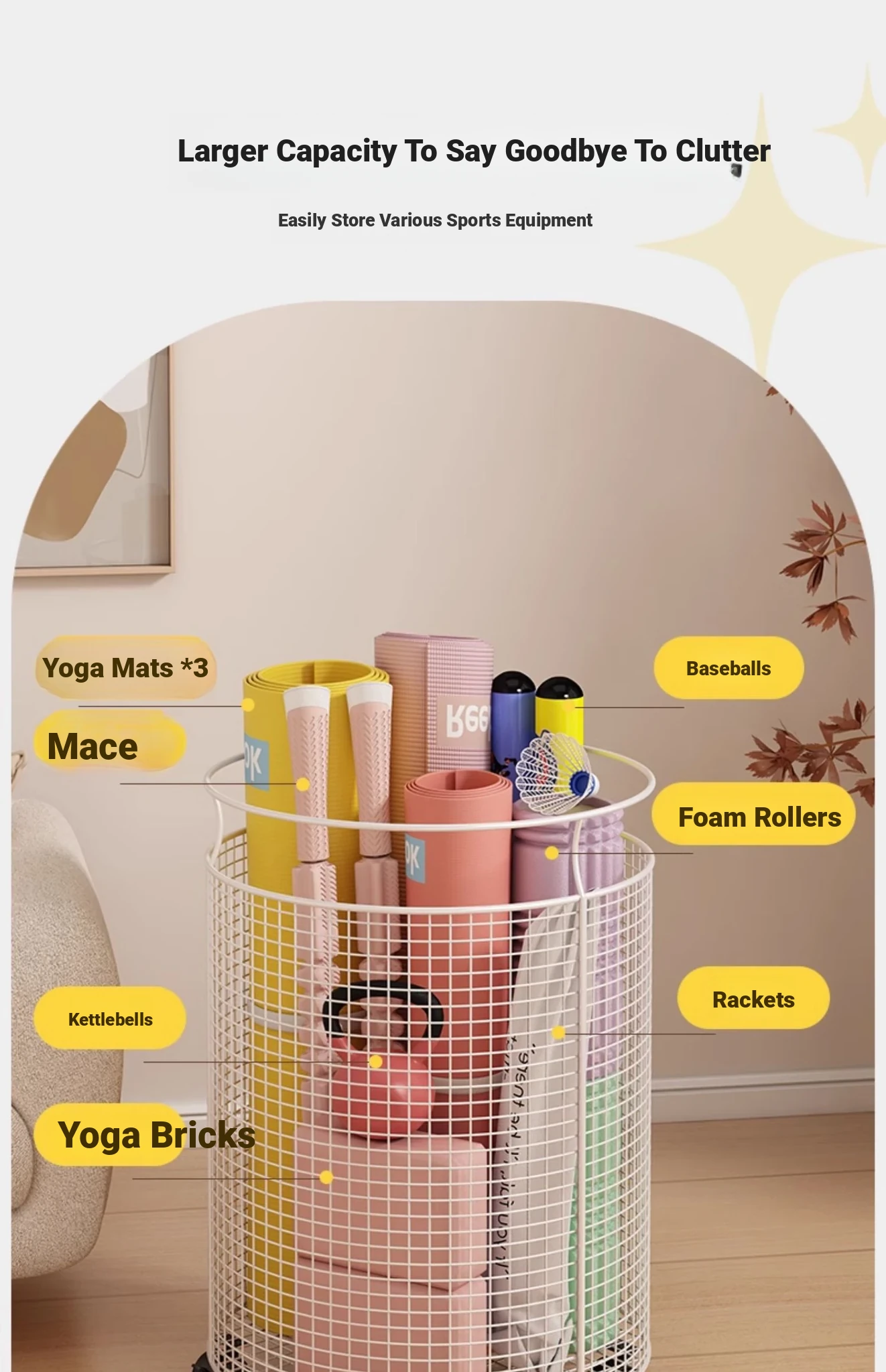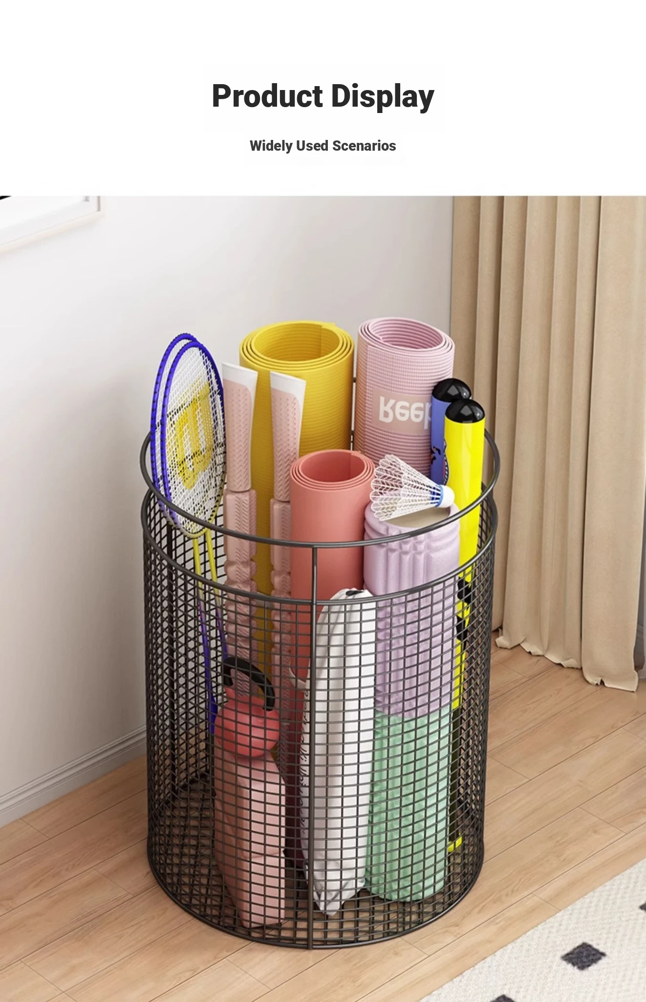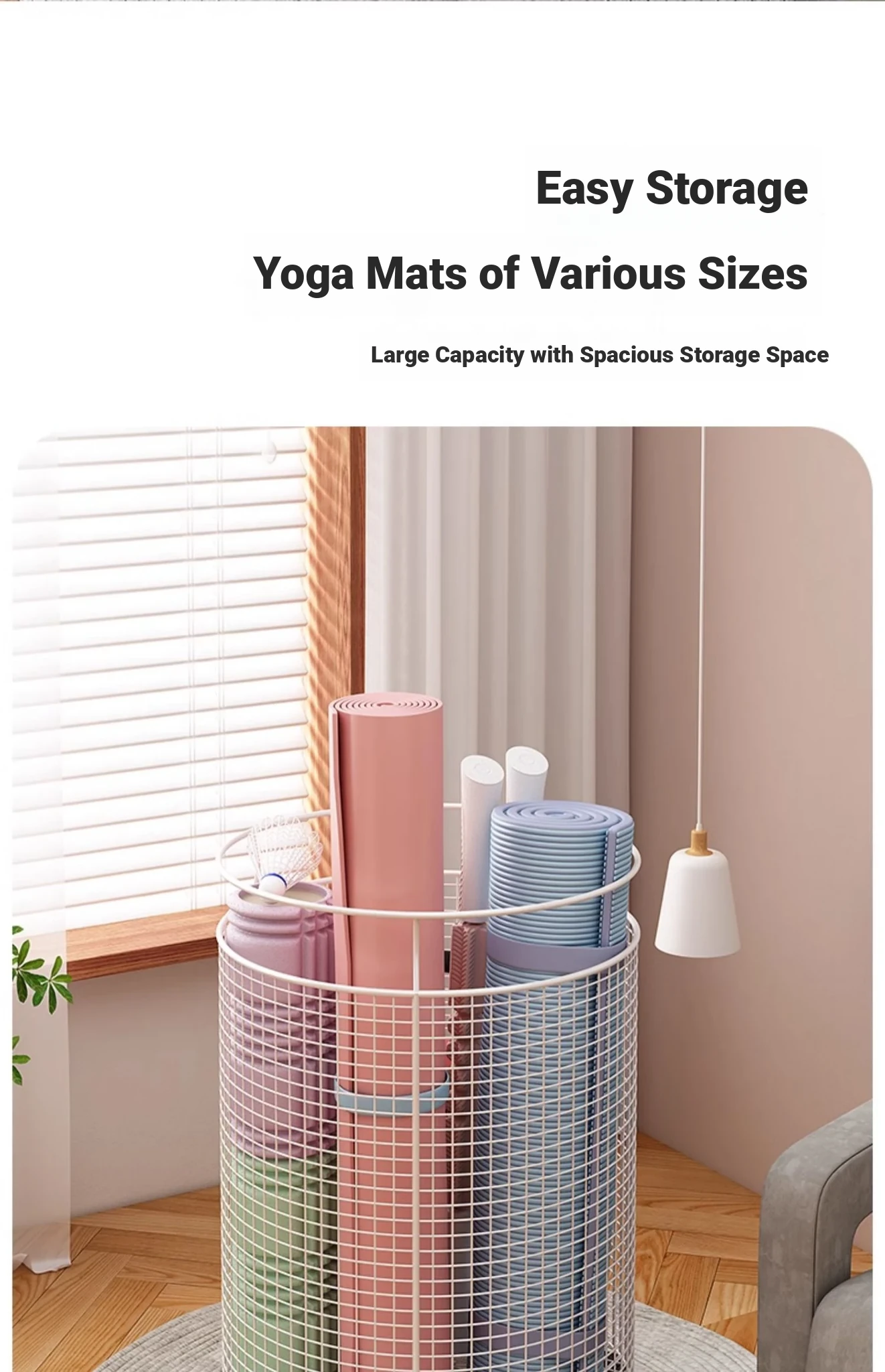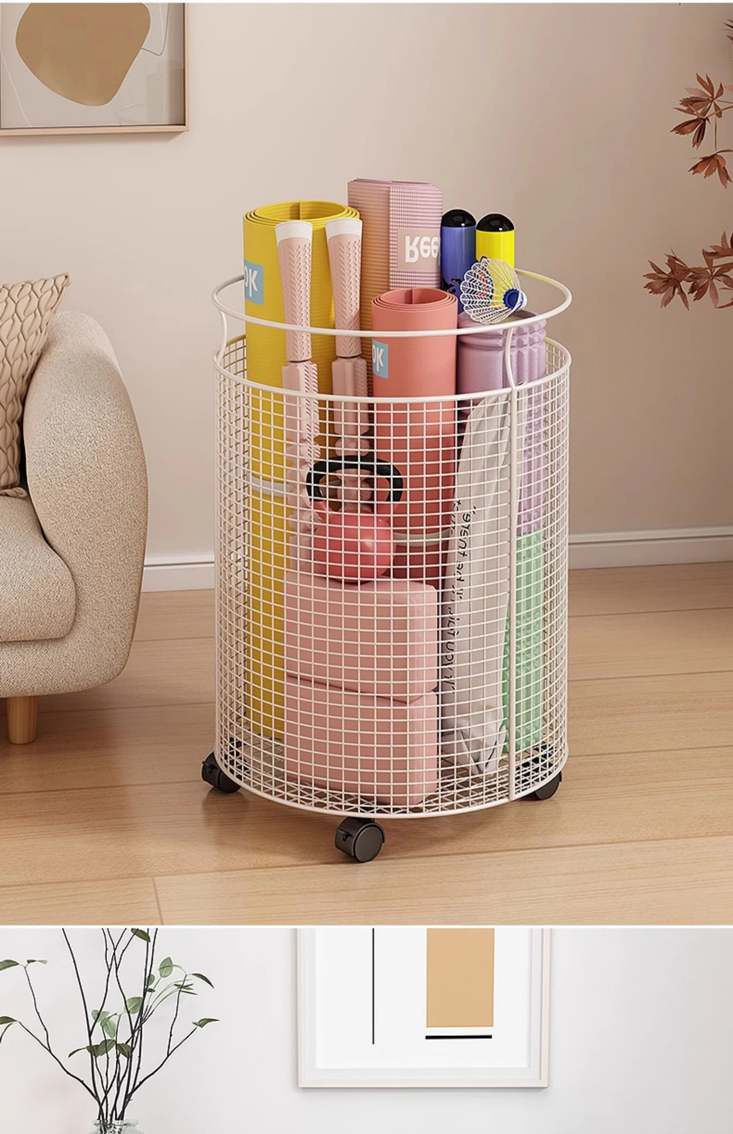 Yoga Mat Storage Rack with Wheels - Multi-functional Floor Organizer for Fitness Equipment, Foam Rollers, and Dumbbells - Stylish Round Storage Bin for Your Home Gym