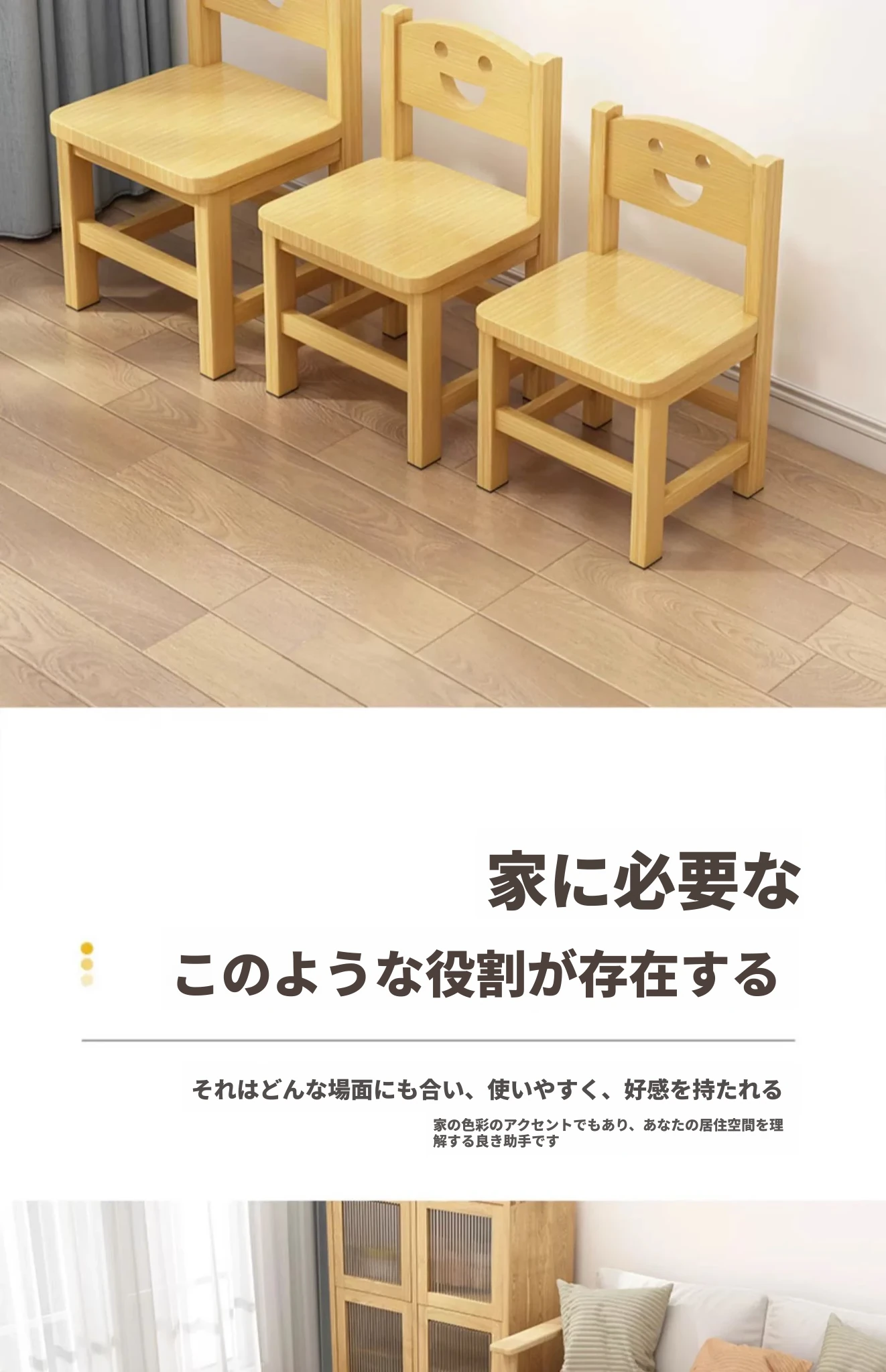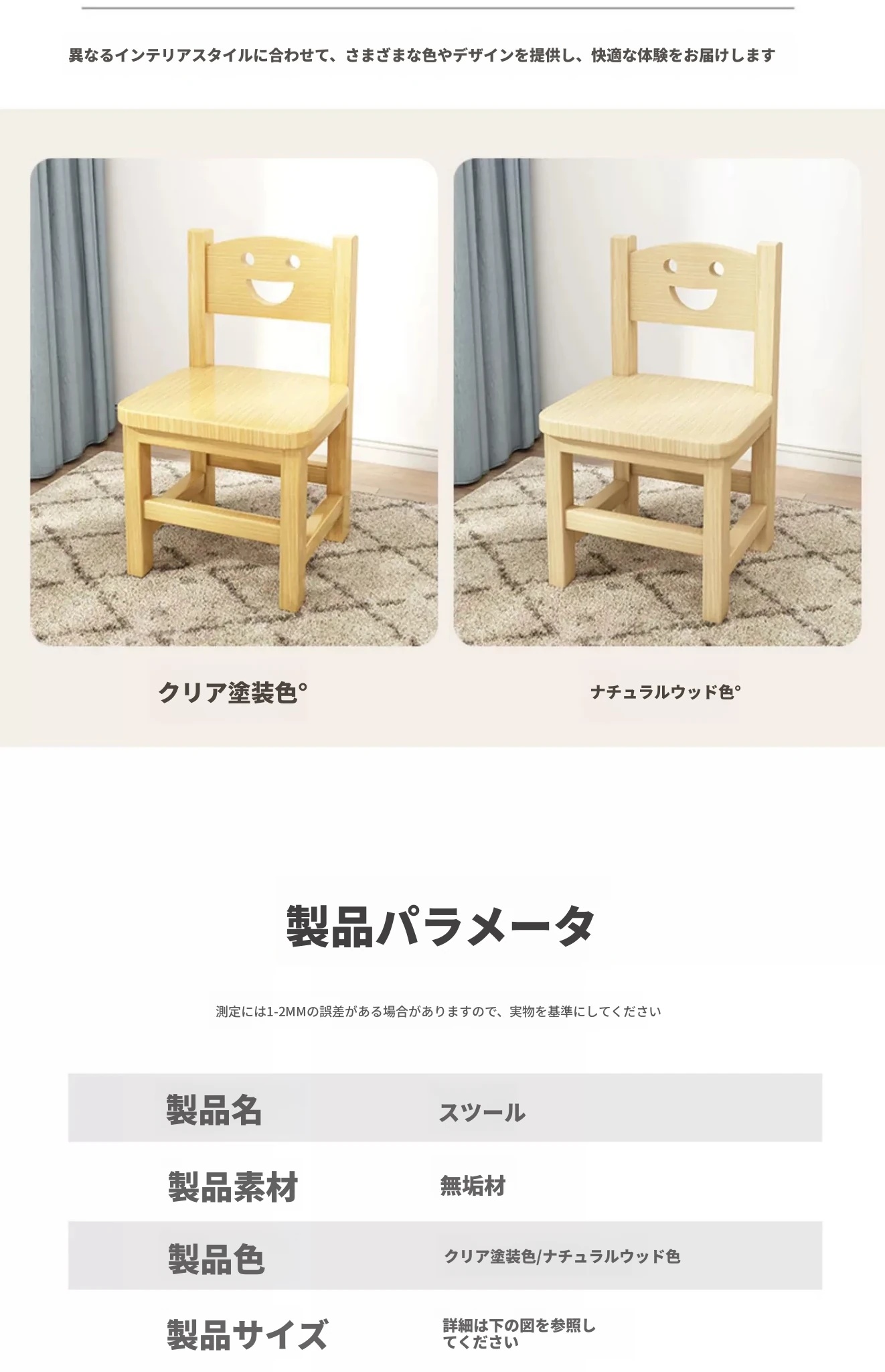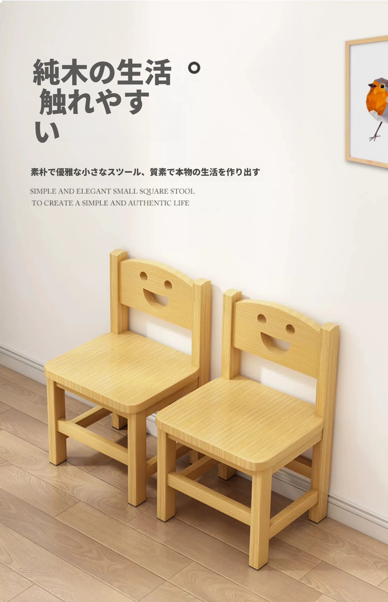 子供用背もたれ付き小椅子|家庭用・赤ちゃんのためのダイニングチェア|無垢材使用|幼稚園にも最適なかわいいスマイルデザイン|コンパクトでおしゃれな小さなスツール!