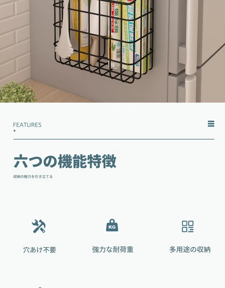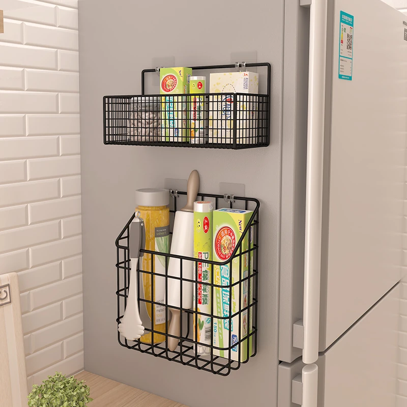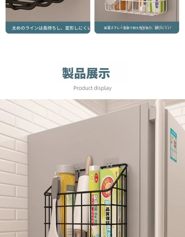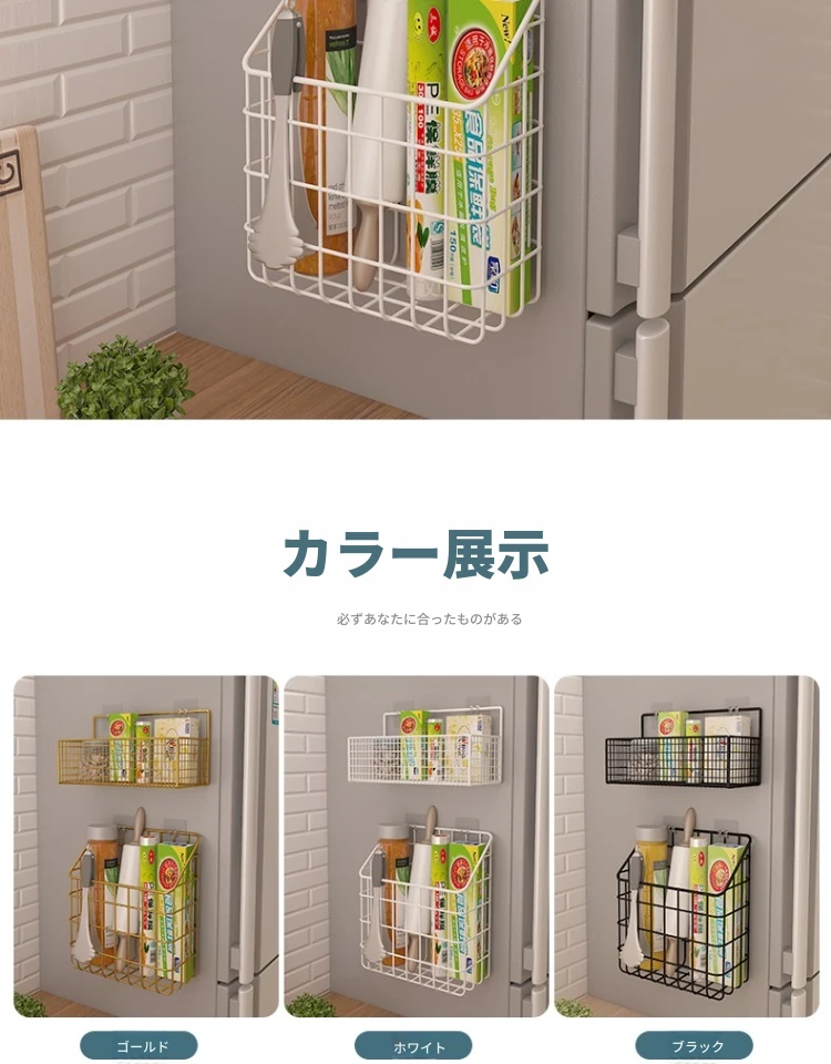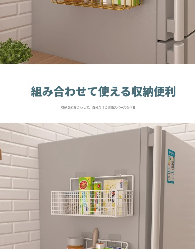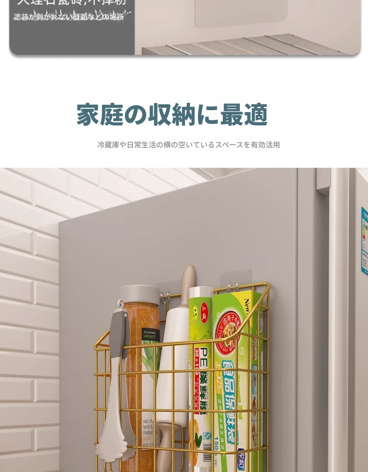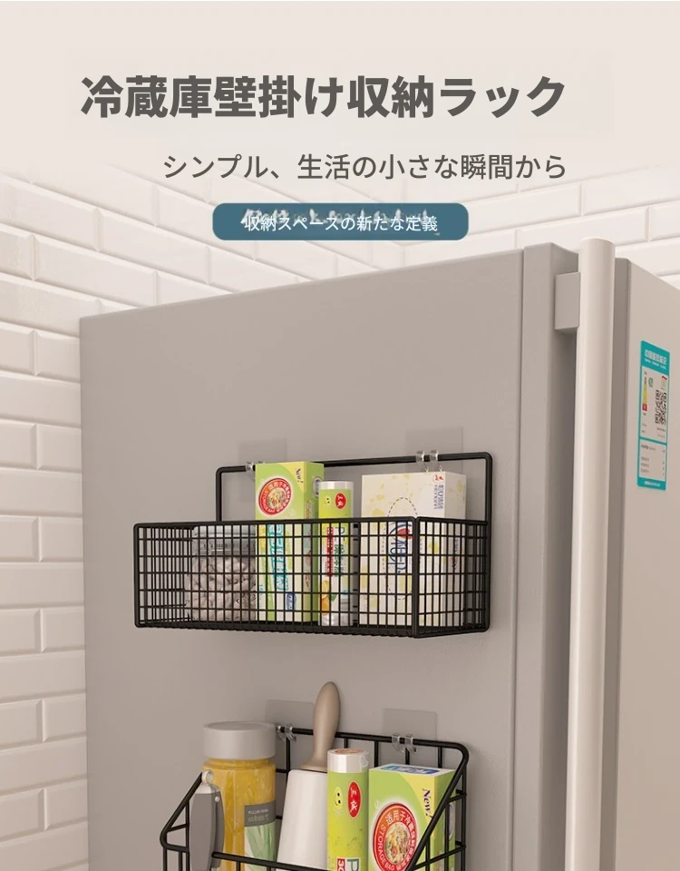 キッチン壁掛け収納ラック - 穴あけ不要!冷蔵庫の側面にピッタリフィットする便利なフック付き収納バスケット。ラップや調味料をスッキリ整理!限られたスペースを有効活用し、キッチンをもっと快適に!