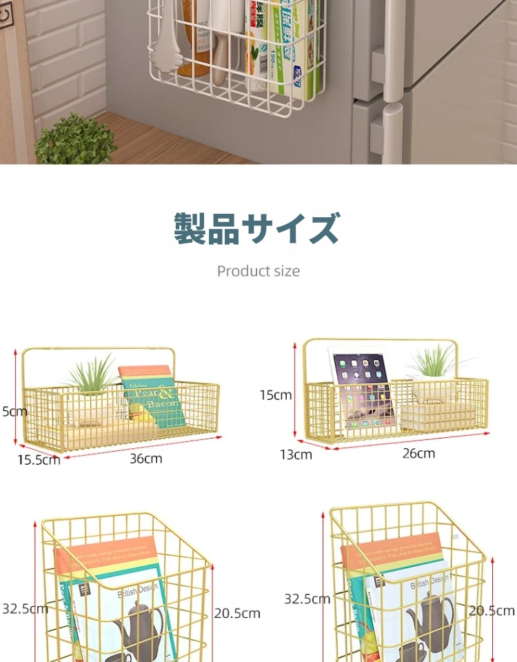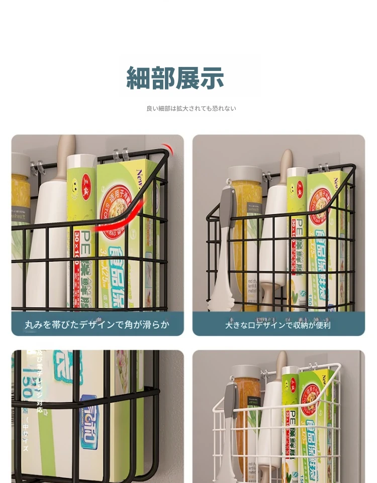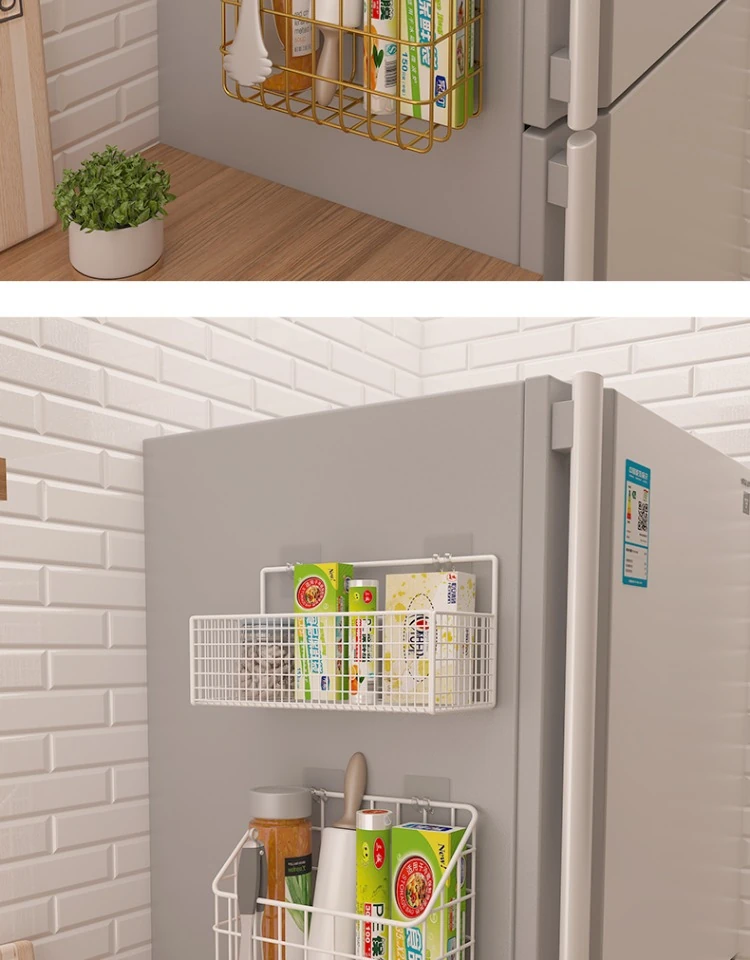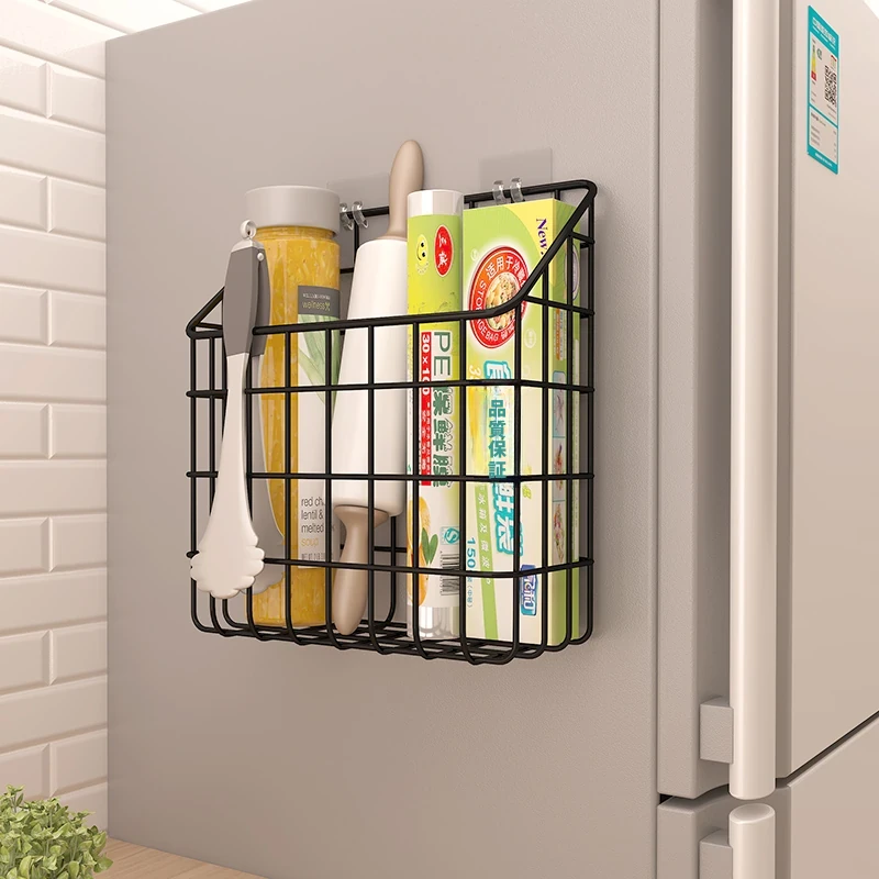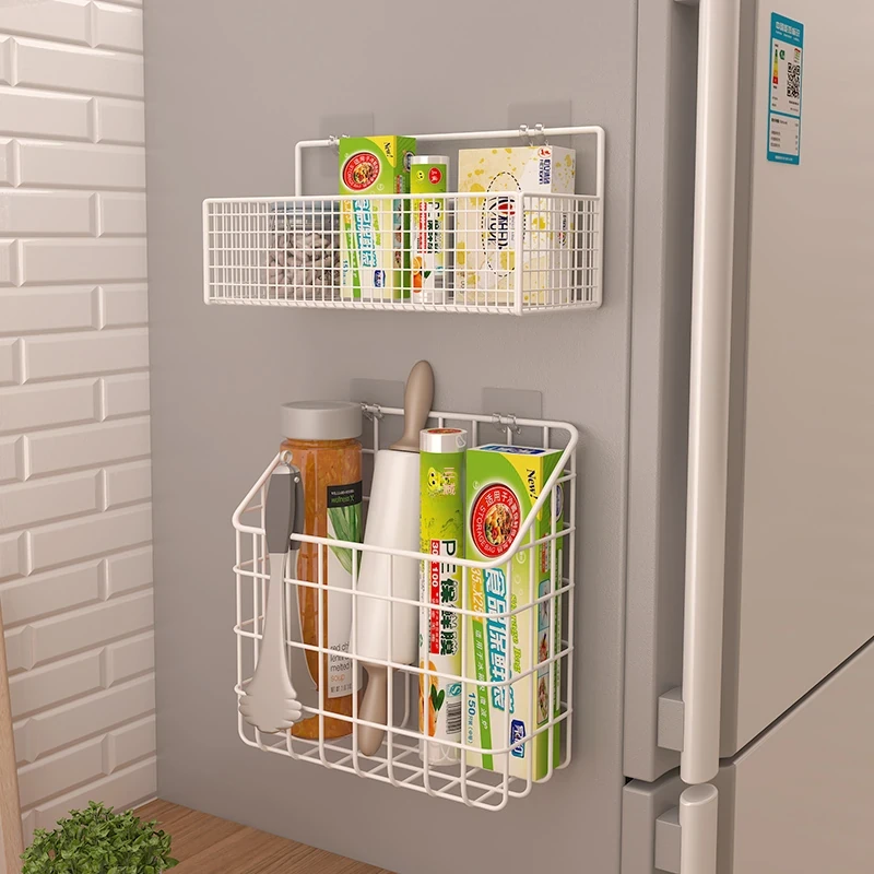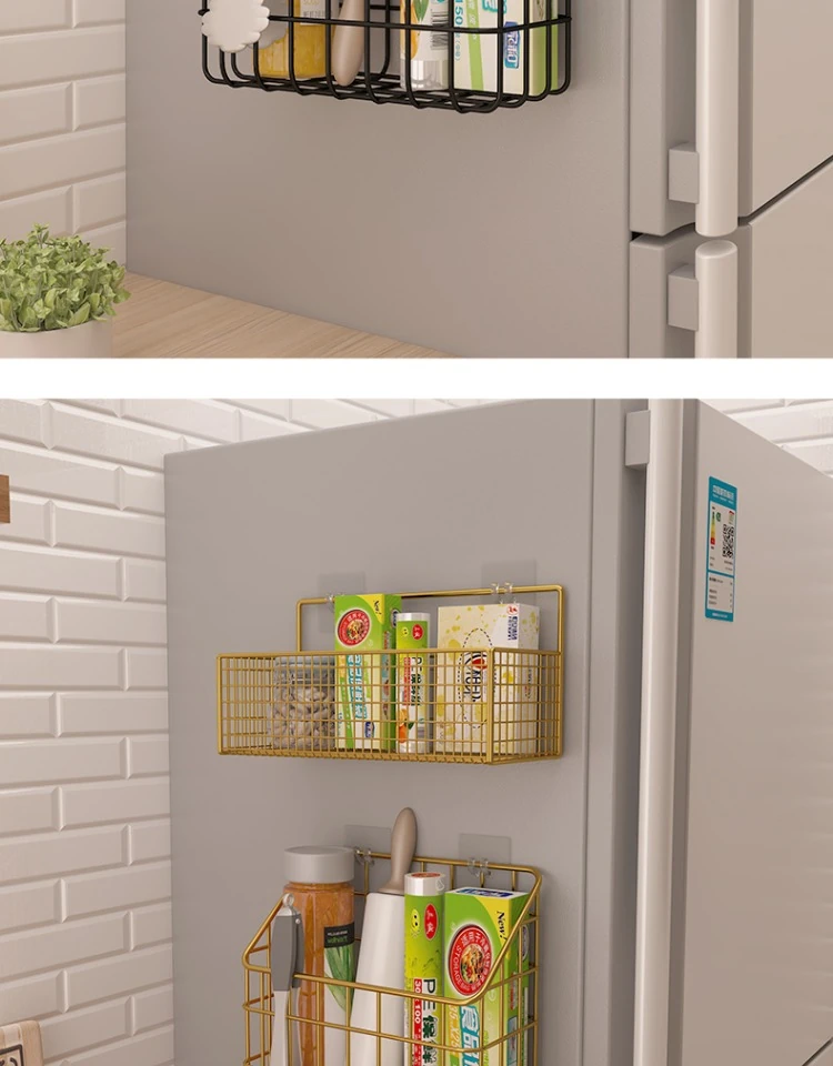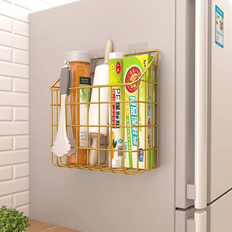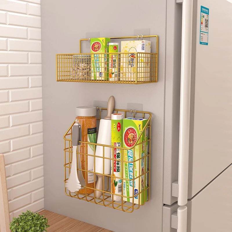 キッチン壁掛け収納ラック - 穴あけ不要!冷蔵庫の側面にピッタリフィットする便利なフック付き収納バスケット。ラップや調味料をスッキリ整理!限られたスペースを有効活用し、キッチンをもっと快適に!
