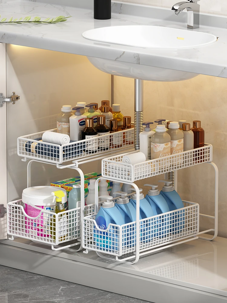水回りをスマートに!引き出し式多機能収納バスルームキャビネット用分層ラック・洗面台用収納バスケット。すっきり整理、スペースを有効活用!