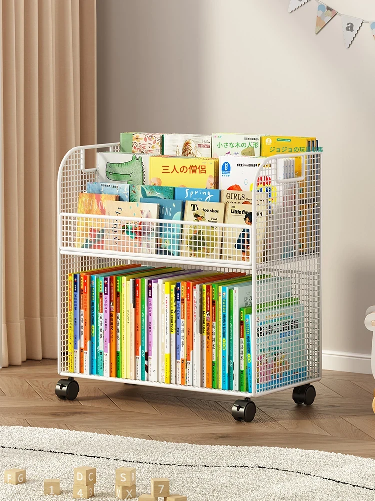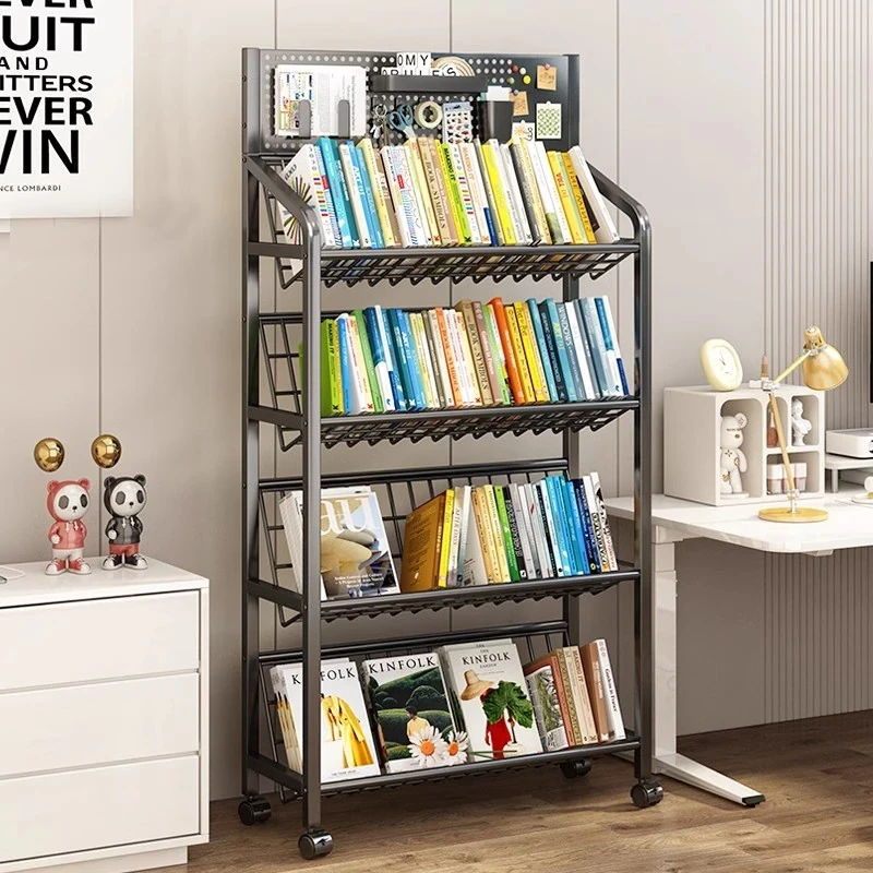アイアンシンプル子供用ブックシェルフ - 移動可能な多層収納ラック、家にぴったりのキャスター付き!お子様の本やおもちゃをスタイリッシュに整理整頓!